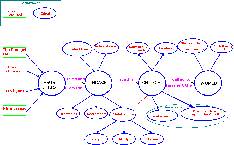 Forty four years later the validity of those affirmations still stand. In this work however, we will be articulating the doctrinal nerve of the Cursillo in four points: Jesus Christ, Grace, the Church and the World. We are going to connect to that axis all Talks and Meditations, since they all form a harmonic collection, and from that axis we will describe the Cursillo theologically.(See Graphic)